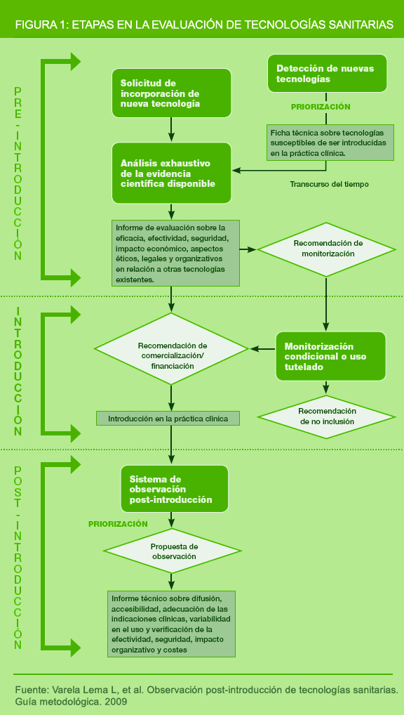 En la última década, respondiendo a la necesidad de los sistemas sanitarios de conocer el valor real de las tecnologías antes de su difusión generalizada, se han puesto en marcha diversas iniciativas para monitorizar tecnologías sanitarias nuevas y emergentes en la práctica habitual y bajo condiciones controladas. Esta monitorización se plantea como una medida que permite la introducción condicional de nuevas tecnologías bajo la recolección adicional de datos. Es un procedimiento desarrollado fundamentalmente para evaluar tecnologías relevantes, con un gran potencial para producir importantes mejorías en la salud o en la calidad de vida, pero para las cuales existen dudas acerca de ciertos aspectos de su seguridad y/o efectividad [6]. La recomendación de uso bajo evaluación se incluye como recomendación en muchos informes de evaluación, como es el caso de los realizados por las agencias españolas (Avalia-t, AETS, Osteba, etc) y otras como CEDIT (Comité Ejecutivo de Desarrollo e Innovación Tecnológica de Paris) o ANZHSN (Red de detección temprana de tecnologías nuevas y emergentes de Australia y Nueva Zelanda). En el ámbito del Sistema Nacional de Salud español, la monitorización condicional de nuevas tecnologías se denomina "uso tutelado", y actualmente está concebido por ley como un procedimiento de evaluación para establecer el grado de seguridad, eficacia, efectividad o eficiencia de una técnica, tecnología o procedimiento antes de decidir sobre la conveniencia o necesidad de su inclusión efectiva en la cartera de servicios del sistema de salud (RD 1030/2006) [6]. Dentro de la Comunidad Autónoma de Galicia (Orden de 7 Julio 2003) y País Vasco (Orden 12 de Noviembre 2004), la normativa específica pone de manifiesto que, en función de la evidencia científica disponible, algunas tecnologías podrán ser consideradas de especial seguimiento, quedando sujetas a criterios específicos de indicación, realización y evaluación que se establezcan [7,8].
