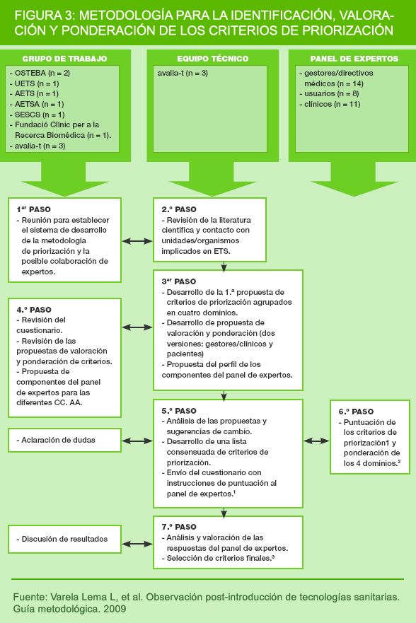 The scoring of the prioritisation criteria and weighting of the domains was carried out by an expert group integrated by a group of subjects representative of the different sectors involved in the adoption and use of new technologies. These include: policy makers (hospital directors and directors of health authority central services, such as health care, health assurance, public health, etc.), clinicians (primary and specialised care) and system end-users (patient associations, consumer and end-user organisations, consultancy groups, community participation groups and other types of users) from the different ARs that collaborated on the project. These panellists were proposed by the working group and technical group and came from their respective Autonomous Regions.