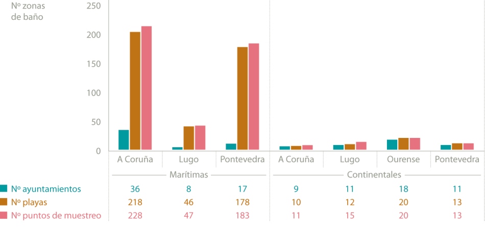 El censo oficial de zonas de baño de la temporada de baño consta de un total de 517 puntos de muestreo de 497 zonas de baño, que se encuentran en 110 ayuntamientos de la comunidad autónoma galega.