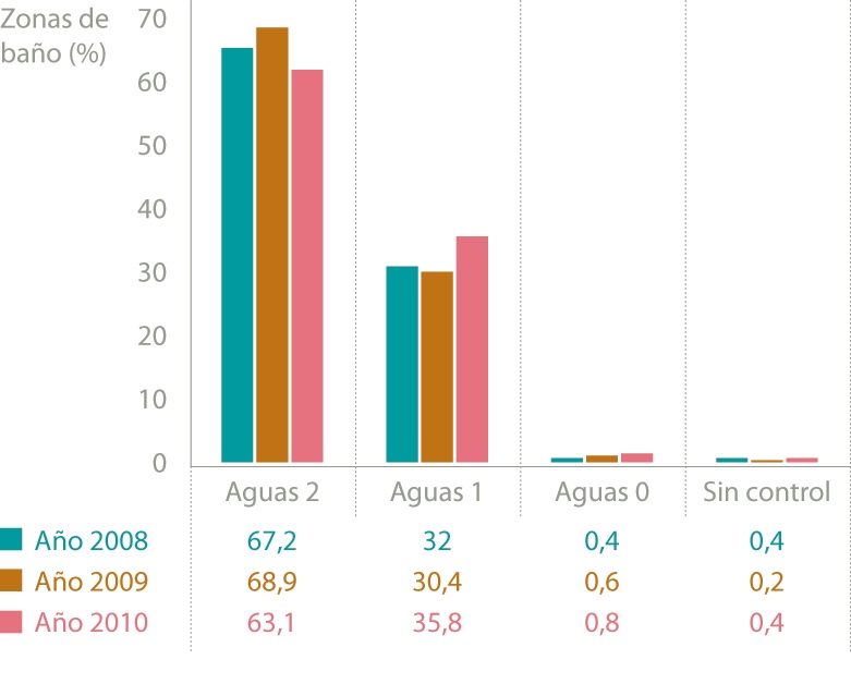 El censo oficial de la temporada 2010 aumentó en 4 zonas de baño y puntos de muestreo respecto a la temporada 2009. En cuanto a la calificación sanitaria, en la figura 2 se muestran los resultados del porcentaje de zonas de baño que obtuvieron cada una de ellas en las tres temporadas.